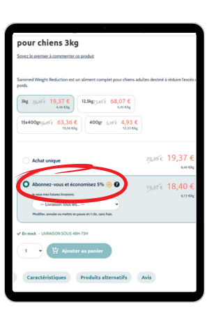 Sur la page du produit que vous souhaitez commander, vous pouvez sélectionner l'option "Abonnement". Vous verrez immédiatement combien vous économiserez.