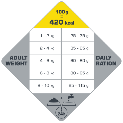 Ingredients | poulet (déshydraté, 35%), riz (25%), farine de riz, graisses animales, fibres végétales (cellulose 4%, pulpe de betterave 1%), graine de lin, protéines animales hydrolysées, huile de saumon, levure de bière, substances minérales, krill, FOS (0,5%), œufs entiers séchés, MOS (0,1%), sels d’acides gras (acide butyrique), algues marines (Ascophyllum nodosum), glucosamine 500 mg/kg, romarin (18 mg/kg), thé vert (12 mg/kg) |