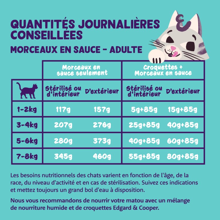 Cette recette est également enrichie en vitamines et minéraux essentiels, favorisant la santé globale de votre chat. Les morceaux tendres en sauce sont non seulement appétissants, mais ils aident également à l'hydratation de votre animal, un aspect souvent négligé dans l'alimentation des chats. En choisissant Edgard & Cooper, vous optez pour une nourriture sans céréales, sans colorants ni conservateurs artificiels, ce qui est idéal pour les chats sensibles ou ayant des problèmes digestifs.