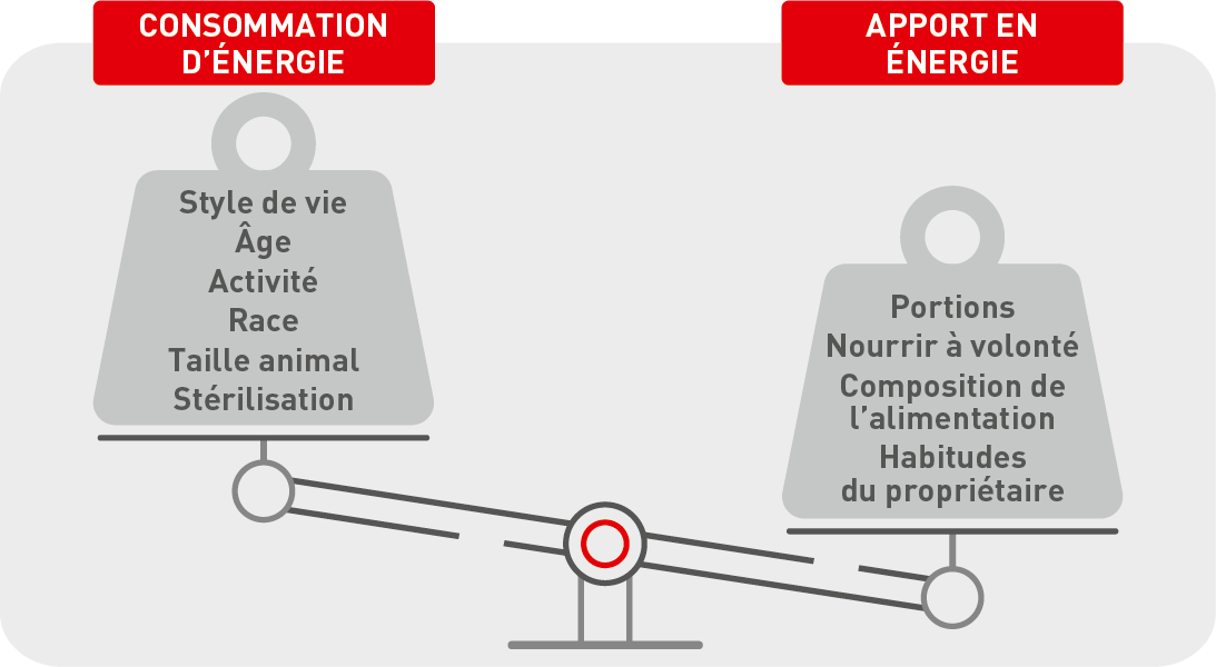 Si un chien ingère plus de calories qu'il n'en consomme, il devient obèse. La consommation d'énergie dépend de la race, de l'âge, de la taille et de l'activité de l'animal. C'est vous qui déterminez l'apport énergétique. Ce que votre chien mange, en quelle quantité et à quel moment, ne dépend que de vous. Un chien en surpoids est en grande partie le résultat d'une alimentation trop fréquente ou de portions trop importantes. D'un excès de grignotages ou d'une alimentation malsaine (grasse).