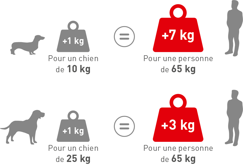 Si un adulte a un kilo de trop, c'est négligeable. Mais si un petit chien de 10 kg a un surpoids de 1 kg, cela équivaut à un surpoids de 7 kg chez l'homme. Et cela devient vite un problème sérieux.