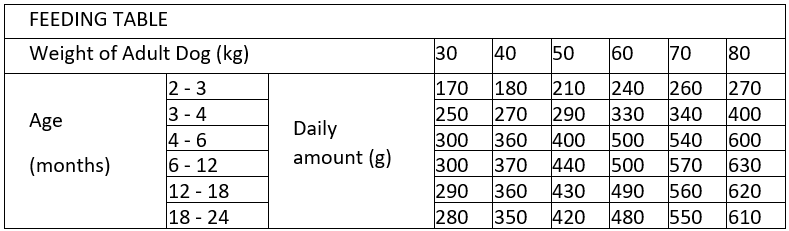 Cet aliment est recommandé pour les chiots et jeunes chiens de grandes races âgés de 2 à 24 mois et dont le poids adulte est supérieur à 30 kg.