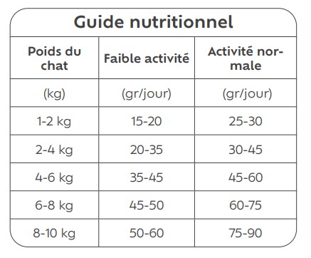 Donnez exclusivement cet aliment diététique, et suivez le programme de nutrition du tableau indiqué sur le devant, cependant vous pouvez ajuster le programme si nécessaire pour maintenir le poids de votre chat.
