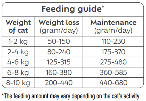 La dose journalière recommandée est basée sur le poids cible du chat. La perte de poids optimale est de 1 à 3 % du poids corporel par semaine ; limitant ainsi la perte de masse musculaire. La quantité de restriction alimentaire nécessaire pour provoquer une perte de poids varie d'un chat à l'autre. Par conséquent, une surveillance étroite - sous la supervision du vétérinaire - est nécessaire pour ajuster régulièrement la ration et s'assurer que la perte de poids est durable. Gardez toujours un œil attentif sur l'état de santé de votre chat, et fournissez-lui toujours de l'eau potable fraîche. Date de péremption, lot et numéro d'agrément : voir emballage. À conserver au frais, à l'abri de la lumière et de l'humidité, de préférence en emballage fermé.