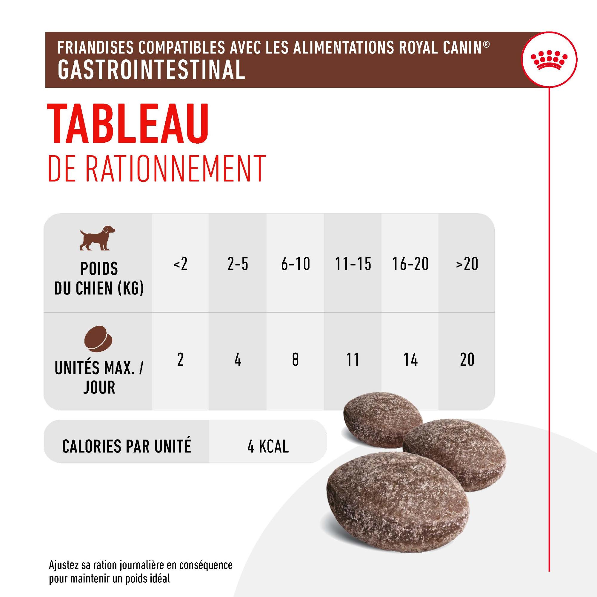Savoureuses friandises adaptées aux chiens de plus de 3 mois, soutenant leur régime Gastrointestinal.