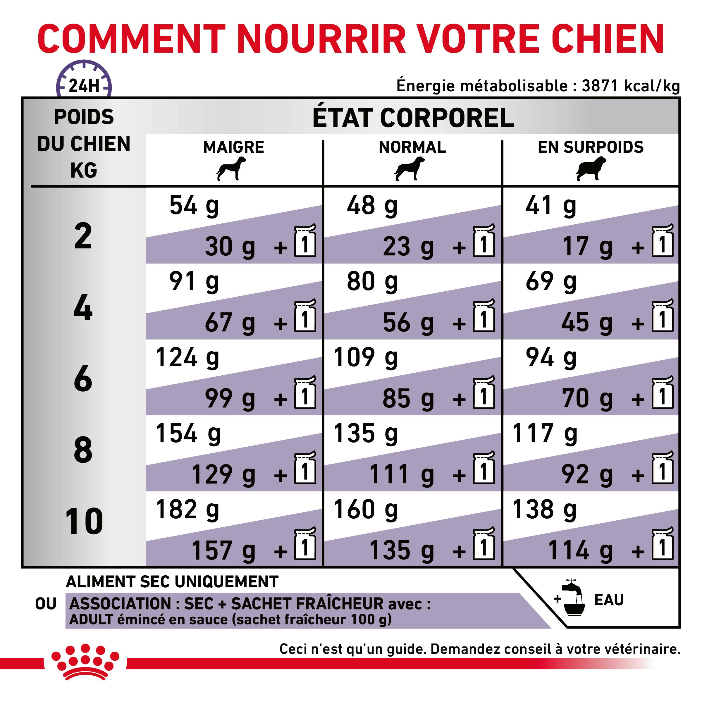 Avant de changer l’alimentation de votre chien, il est recommandé de consulter votre vétérinaire pour vous assurer que ROYAL CANIN® Adult Small Dogs est le choix le plus approprié. Si vous décidez de modifier son alimentation, veillez à effectuer une transition progressive sur une période de 7 jours pour garantir une adaptation en douceur. Respectez également les quantités journalières conseillées, surtout si votre chien consomme à la fois des aliments secs et humides.