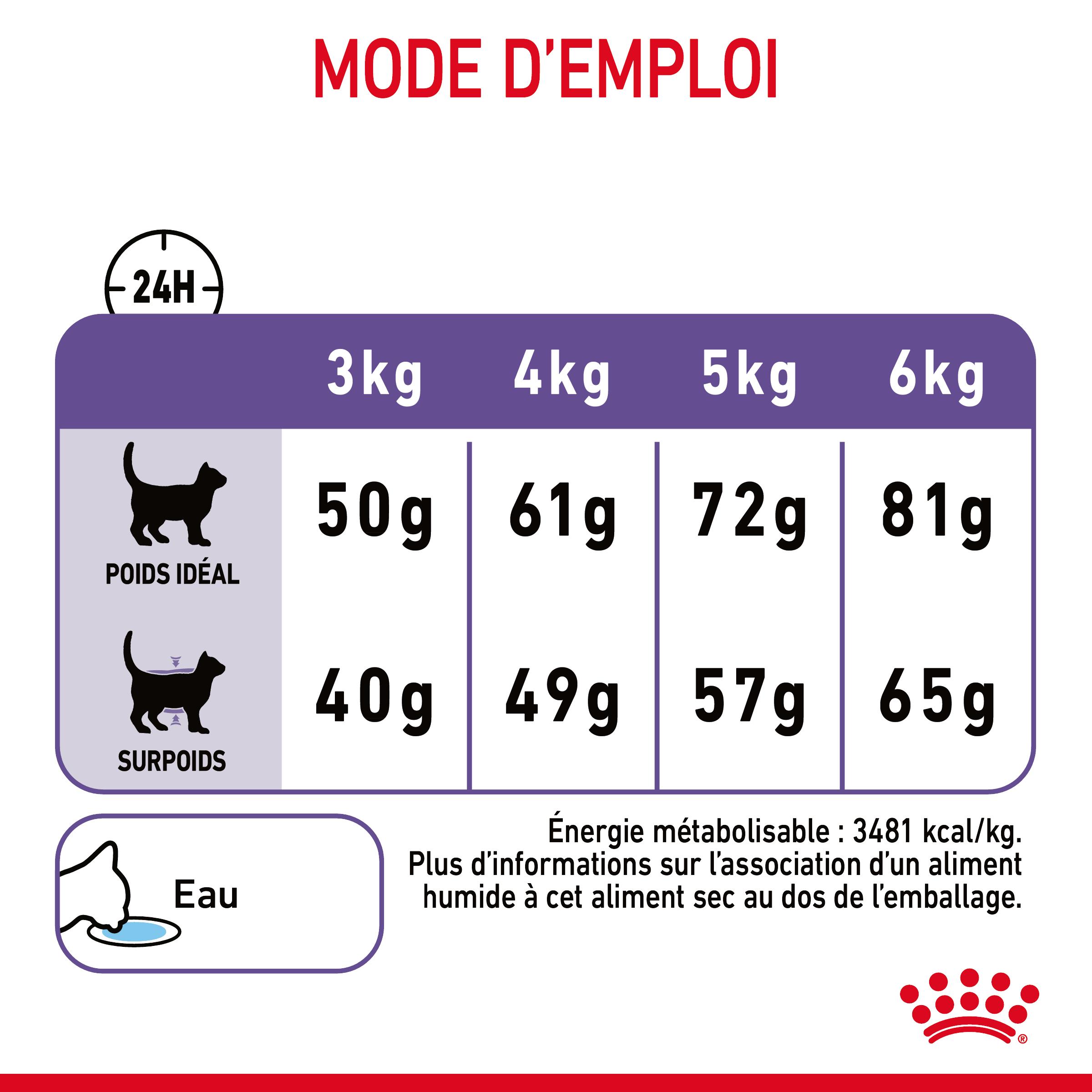 <table><thead><tr><th><table style="font-weight: 400; text-align: start;"><thead><tr><th>Poids du chat</th></tr></thead></table></th><th> INACTIF (faibles besoins énergétiques)<p class="MsoListParagraph" style="margin-left:2.0in;mso-add-space:auto; text-indent:-.25in;mso-list:l0 level4 lfo1"><o:p></o:p></p></th><th>POIDS IDÉAL (besoins énergétiques normaux)<p class="MsoListParagraph" style="margin-left:2.0in;mso-add-space:auto; text-indent:-.25in;mso-list:l0 level4 lfo1"><o:p></o:p></p></th></tr></thead><tbody><tr><td>3 kg</td><td> 40 g (4/8 gobelet doseur)<br></td><td>50 g (5/8 gobelet doseur)<br></td></tr><tr><td>4 kg</td><td> 49 g (5/8 gobelet doseur)<br></td><td>61 g (6/8 gobelet doseur)<br></td></tr><tr><td>5 kg </td><td> 57 g (5/8 gobelet doseur)<br></td><td>72 g (7/8 gobelet doseur)<br></td></tr><tr><td>6 kg</td><td> 65 g (6/8 gobelet doseur)<br></td><td>81 g (1 gobelet doseur)<br></td></tr></tbody></table><br>
