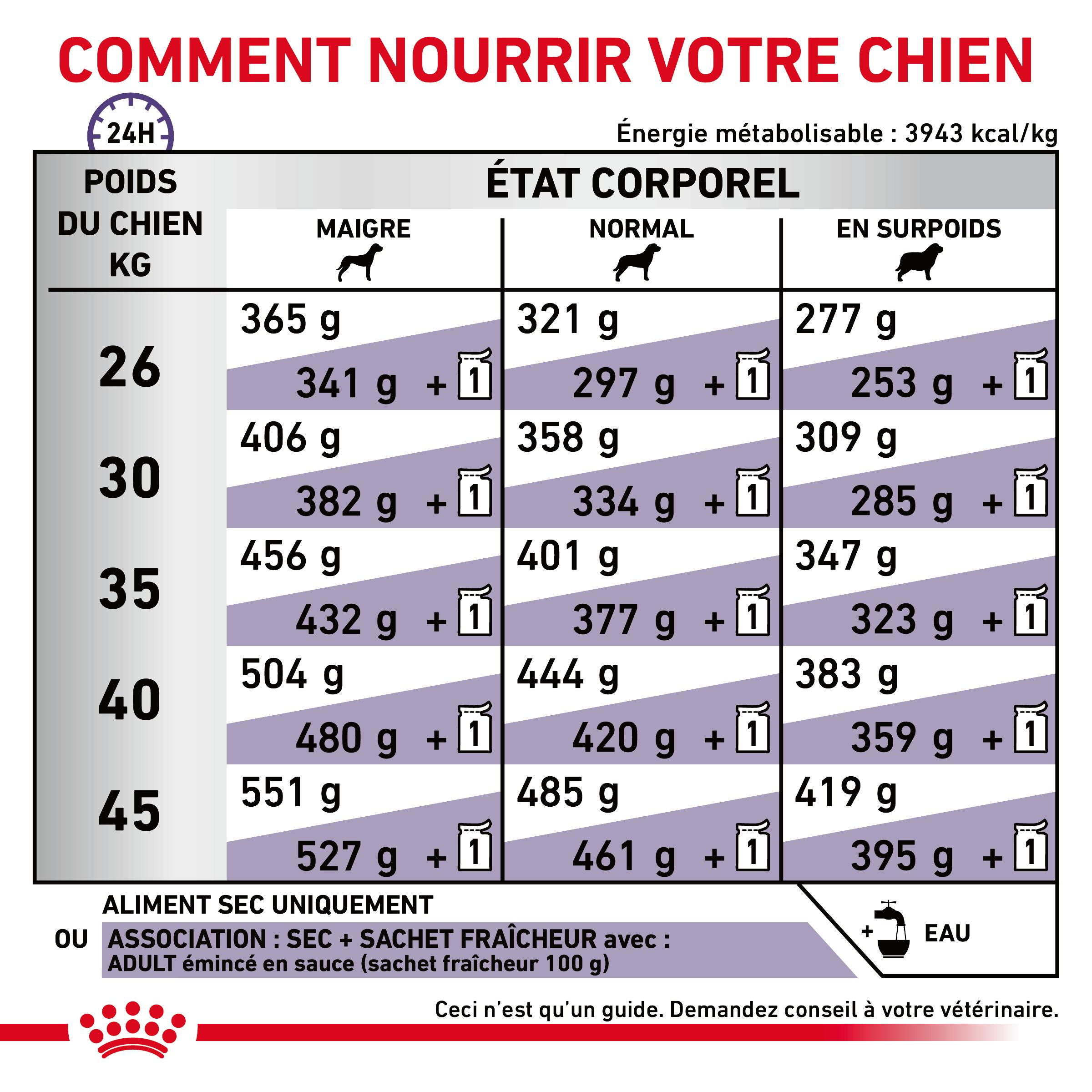 Avant d'introduire ROYAL CANIN® Adult Large Dogs dans l'alimentation de votre chien, il est recommandé de consulter votre vétérinaire pour vous assurer que cet aliment est le plus approprié. Si vous décidez de modifier son alimentation, veillez à effectuer une transition progressive sur une période de 7 jours pour garantir une adaptation en douceur. Respectez également les quantités journalières conseillées, surtout si votre chien consomme à la fois des aliments secs et humides.