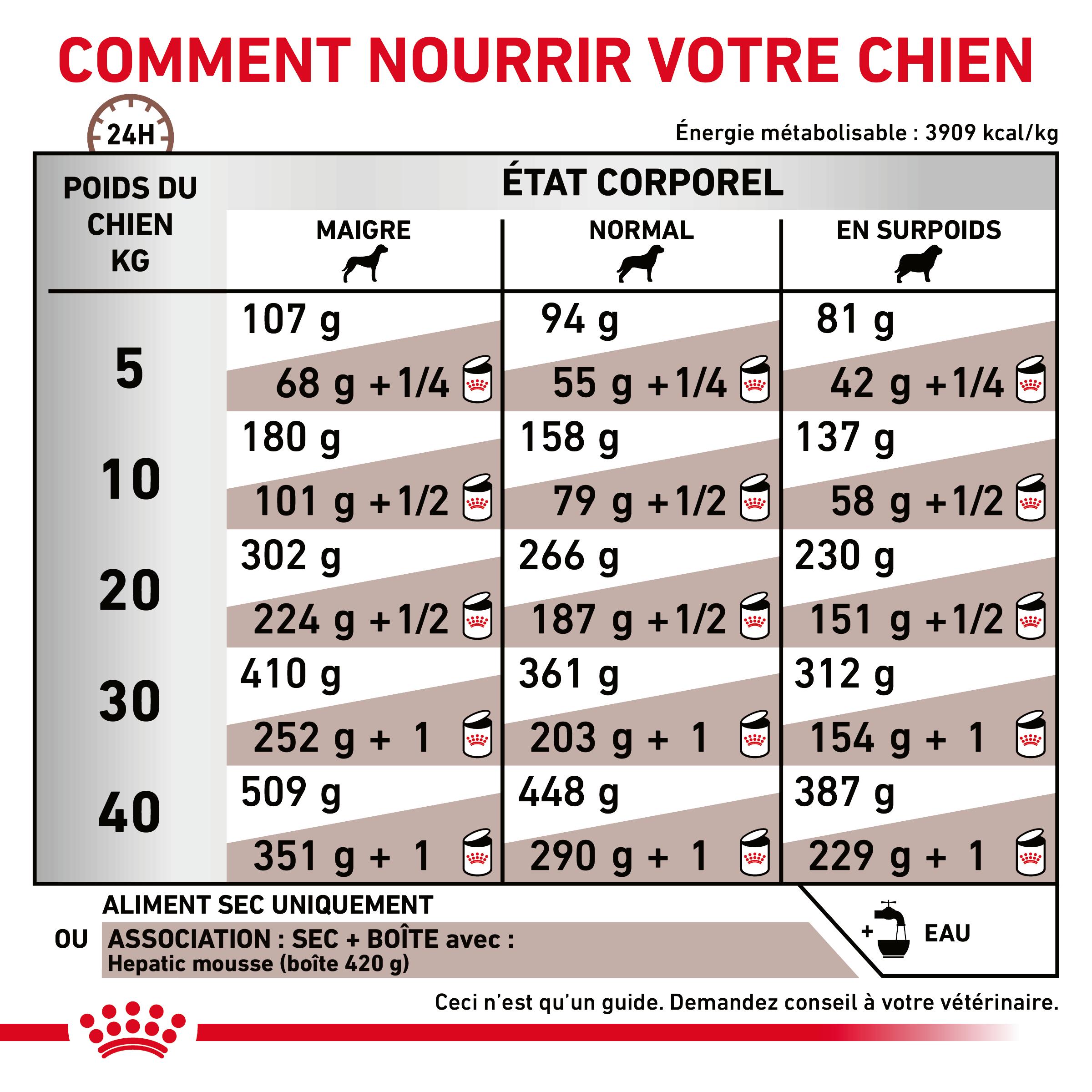 Avant d'introduire ROYAL CANIN® Hepatic dans l'alimentation de votre chien, il est essentiel de consulter votre vétérinaire pour s'assurer que cet aliment est le choix approprié. Si vous décidez de changer son alimentation, veillez à effectuer une transition progressive sur une période de 7 jours pour garantir une adaptation en douceur. Respectez également les quantités journalières recommandées, notamment si vous combinez des aliments secs et humides.