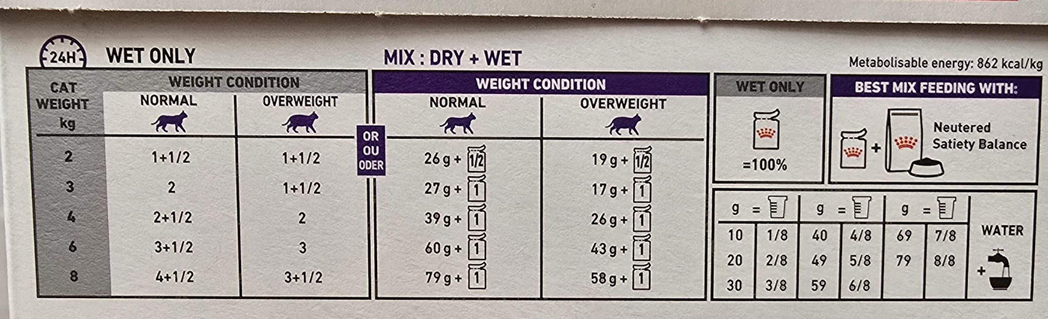 Les sachets fraîcheur Royal Canin Neutered Adult Maintenance sont également adaptés aux chats stérilisés difficiles présentant un faible appétit, en leur apportant une alimentation appétente, sous forme de sachets fraîcheur de 100 grammes.