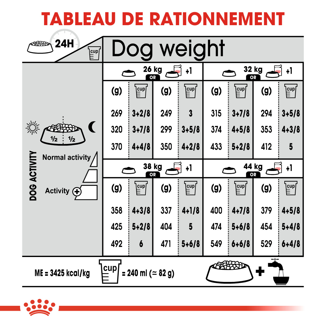 <table><thead><tr><th>Poids du chien</th><th>26 kg</th><th>-</th><th>32 kg</th><th>-</th><th>38 kg</th><th>-</th><th>44 kg</th><th>-</th></tr></thead><tbody><tr><td>Vie à l’intérieur - pas d’exercice</td><td>269 g</td><td>3+2/8 gobelet doseur </td><td>315 g</td><td>3+7/8 gobelet doseur </td><td>358 g</td><td>4+3/8 gobelet doseur </td><td>400 g</td><td>4+7/8 gobelet doseur </td></tr><tr><td>Activité normale</td><td>320 g</td><td>3+7/8 gobelet doseur </td><td>374 g</td><td>4+5/8 gobelet doseur </td><td>425 g</td><td>5+2/8 gobelet doseur </td><td>474 g</td><td>5+6/8 gobelet doseur </td></tr><tr><td>Chiens très actifs</td><td>370 g</td><td>4+4/8 gobelet doseur </td><td>433 g</td><td>5+2/8 gobelet doseur </td><td>492 g</td><td>6 gobelet doseur </td><td>549 g</td><td>6+6/8 gobelet doseur </td></tr></tbody></table>